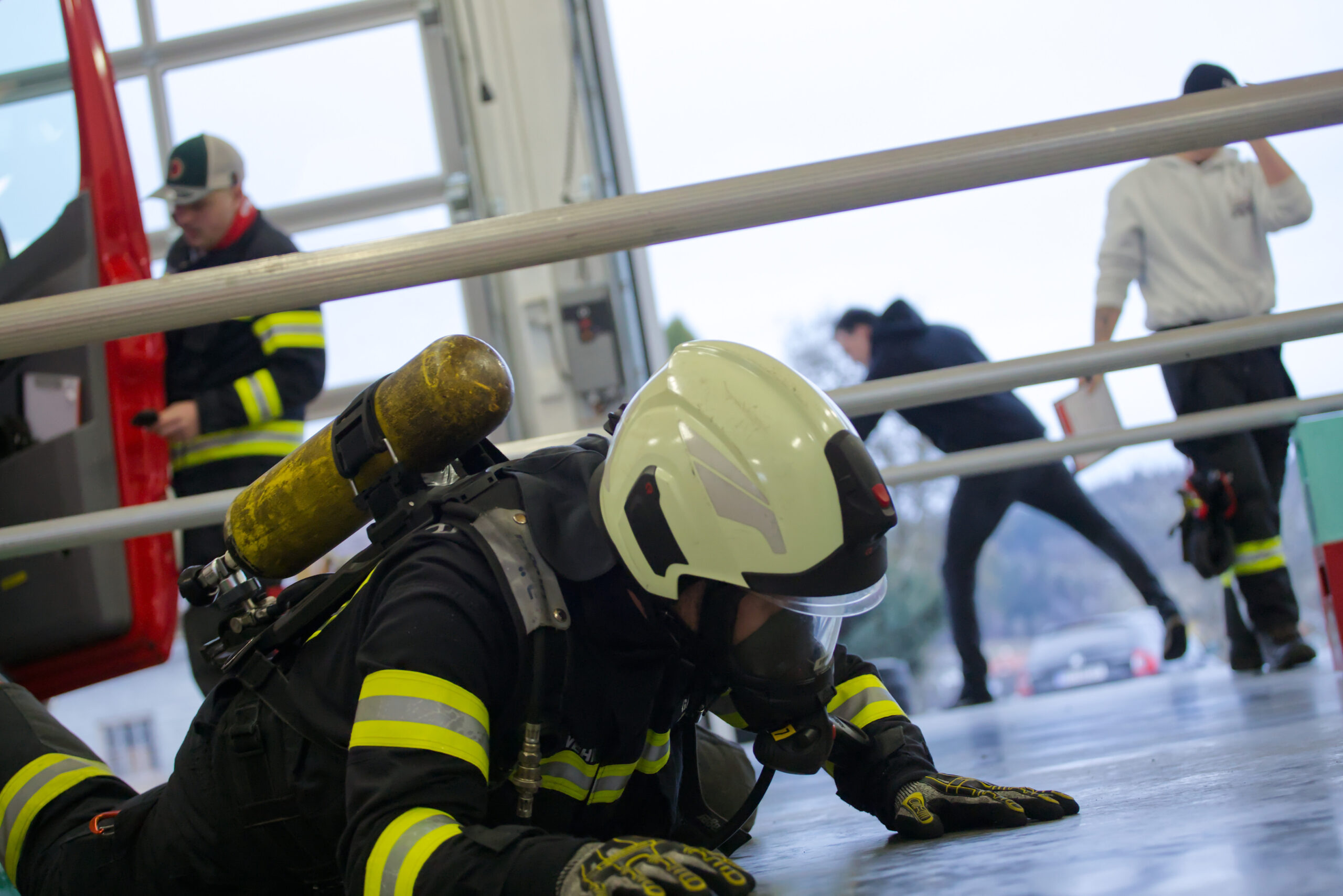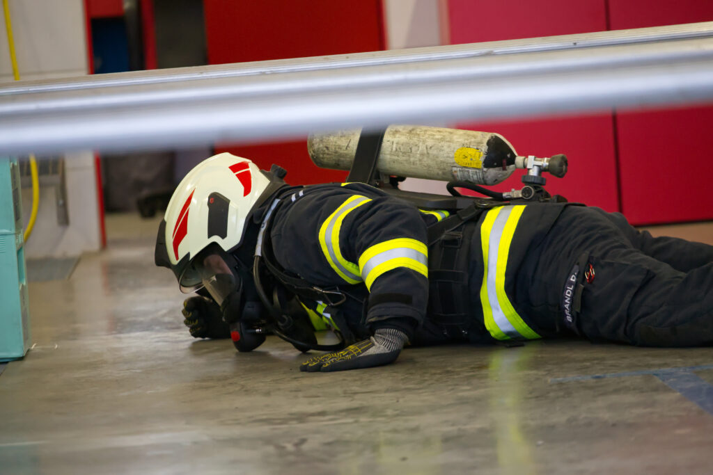Der sogenannte Finnentest ist ein genormter Leistungstest, bei dem mehrere Stationen in kompletter Einsatzbekleidung und mit Pressluftatmer absolviert werden müssen. Ziel ist es, die Belastungen eines realen Einsatzes möglichst praxisnah zu simulieren und sicherzustellen, dass Kraft, Ausdauer und Koordination unter Atemschutz ausreichend vorhanden sind.